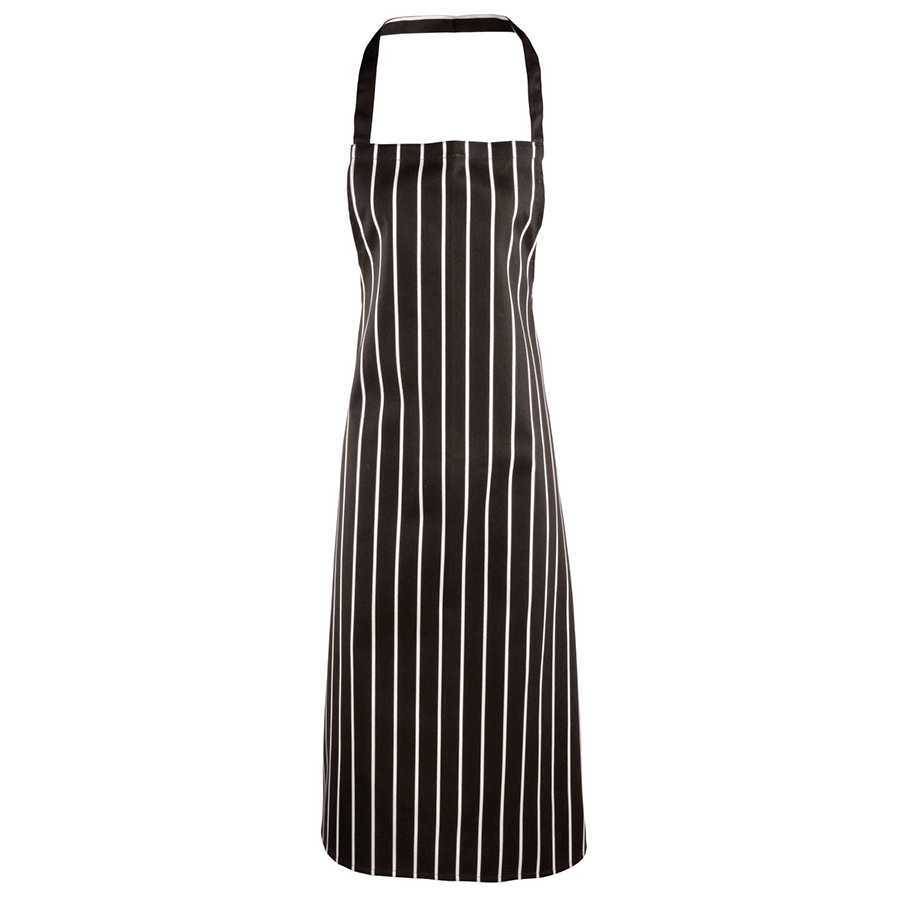Dit horeca schort heeft een stijl die geliefd is bij de meer traditionele rollen. Dit gestreepte schort, ook wel een slagers schort genoemd, is verkrijgbaar in een zwarte uitvoering met grijze of witte strepen en een donkerblauwe variant met witte strepen. Het gestreepte patroon loopt hierbij ook door in de nek en bevestigingsbanden. Het schort is extra lang met ene lengte van 101cm. Dankzij een schuifgesp op de halsband is de lengte van dit schort eenvoudig te verstellen en op maat te maken.